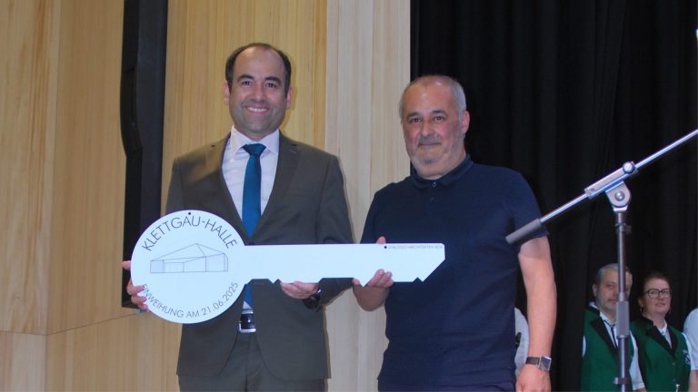 Mit einem dreitägigen Fest wurde vom 20. - 22. Juni 2025 die Fertigstellung der Klettgau-Halle gefeiert. Gemeinsam mit dem symbolischen Schlüssel wurde die neue Mehrzweckhalle an die Gemeinde übergeben und dient nun als sportlich-kultureller Mittelpunkt des Vereinslebens und der Ortschaft Geißlingen. Foto: Eva Baumgartner